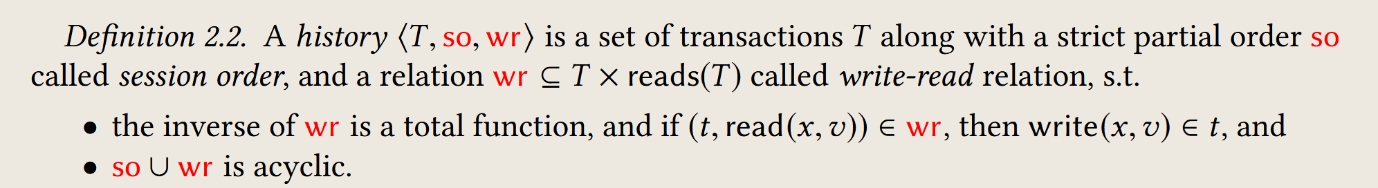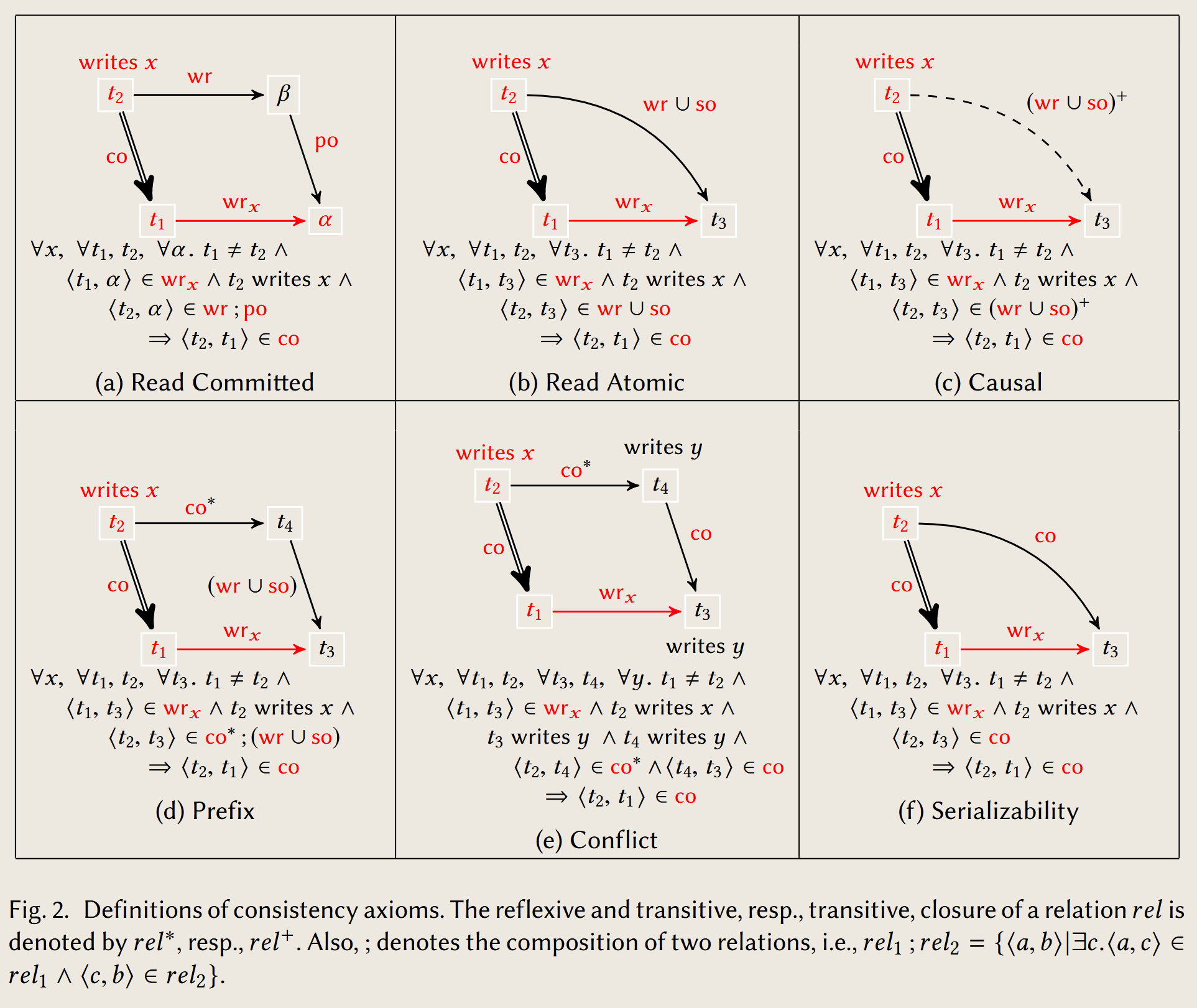 $$ \newcommand{\rel}[1]{\xrightarrow{#1}} \newcommand{\WR}{\textsf{WR}} \newcommand{\wr}{\textsf{wr}} \newcommand{\read}{\textsf{read}} \newcommand{\WW}{\textsf{WW}} \newcommand{\RW}{\textsf{RW}} \newcommand{\RC}{\textbf{\textup{RC}}} \newcommand{\RA}{\textbf{\textup{RA}}} \newcommand{\CC}{\textbf{\textup{CC}}} \newcommand{\PC}{\textbf{\textup{PC}}} \newcommand{\PSI}{\textbf{\textup{PSI}}} \newcommand{\SI}{\textbf{\textup{SI}}} \newcommand{\StwoPL}{\textbf{\textup{S2PL}}} \newcommand{\SSI}{\textbf{\textup{SSI}}} \newcommand{\SER}{\textbf{\textup{SER}}} \newcommand{\SERm}{\textbf{$\textup{SER}^{-}$}} $$